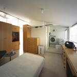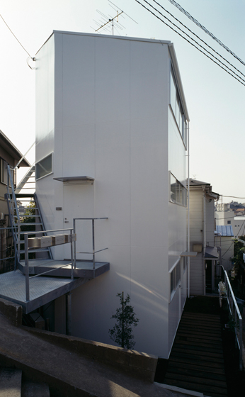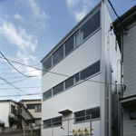 東京板橋区の木賃アパート密集地域に建つアパートメント。1.2.3Fとも全く同じ平面のワンルームであるが、玄関の位置が違うためそれぞれ異なるアプローチを通って入る。階高.窓の高さが違うため同じ平面でも部屋の広がりや方向性に変化が生まれる。収納や長押.ポストなどの賃貸住宅アイテムは「しまう.かける.いれる」のように一旦行為に置き換えてからデザインし直している。